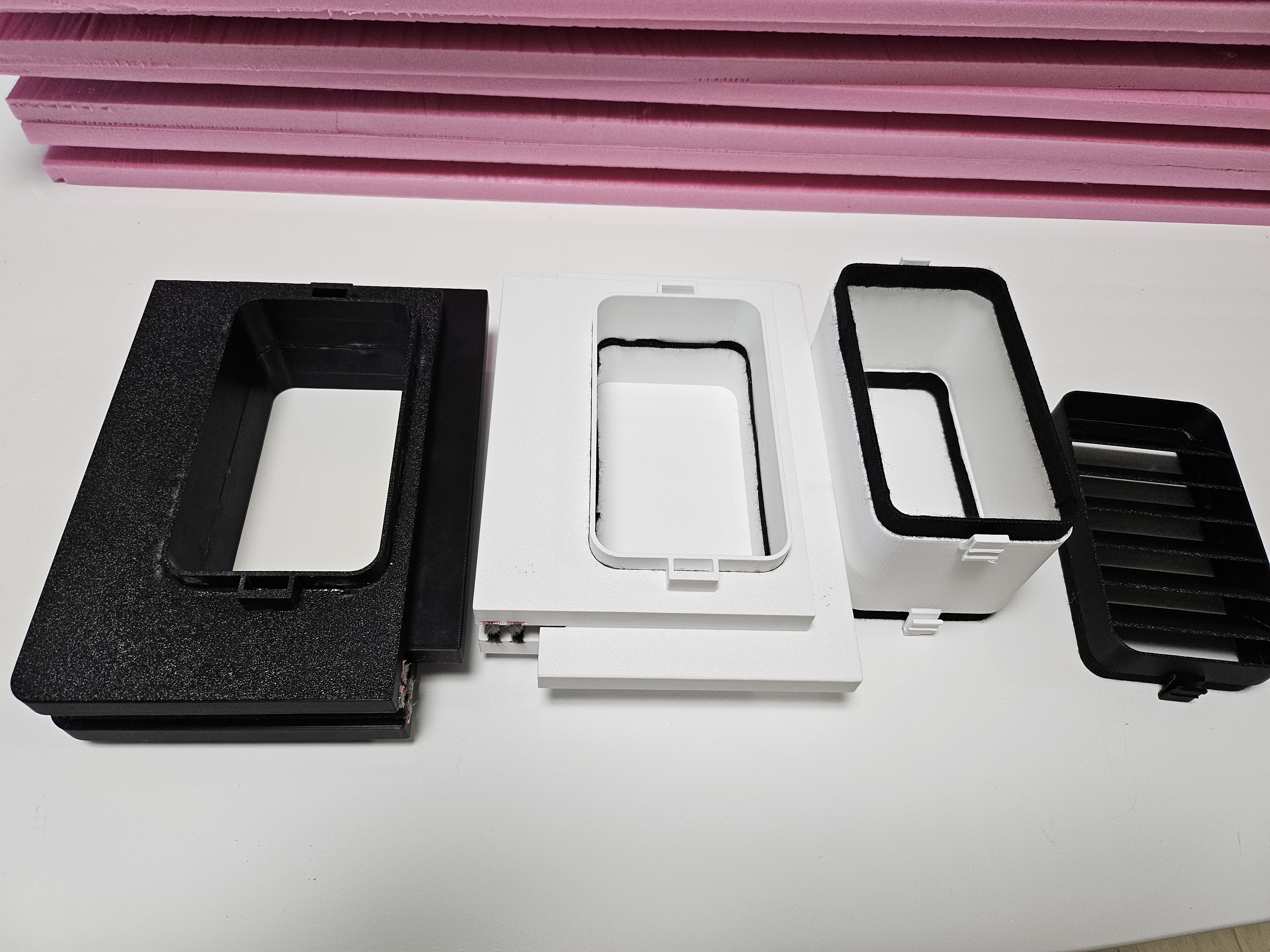 이제 정밀하게 재단된 아이소핑크 단열재를 끼워 넣어 빈 공간을 메울 차례입니다. 먼저 바깥쪽 창문 위쪽에 단열재를 끼웠습니다. 작업하다 보니 어느새 해가 져서 어두워졌지만, 3D 프린팅 본체와 단열재가 빈틈없이 완벽하게 맞아떨어지는 모습을 확인하는 순간 묘한 희열이 느껴졌습니다.